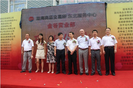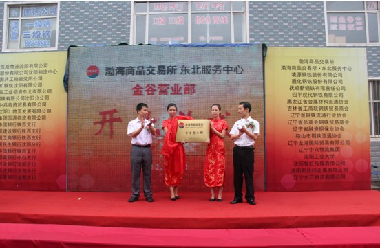 2012年8月1日,渤海商品交易所东北服务中心的首家营业部----北一路金谷营业部在中国钢铁物资有限公司(钢材市场)举行了隆重的开业庆典。渤海商品交易所钢铁事业部总经理张雄军,抚顺新抚钢、凌源钢铁、通化钢铁、四平现代钢铁代表,中储发展股份沈阳物流中心、沈阳中兵物资代表,哈尔滨、吉林、辽宁钢协代表,中国银行、建设银行、工商银行、招商银行、兴业银行、中信银行、华夏银行、民生银行、大连银行代表,省融资担保协会代表,沈阳工业大学经济学院院长张孟才,渤海商品交易所东北服务中心主任马培强,渤海商品交易所北一路金谷营业部总经理郭志刚及众多钢材贸易商、知名媒体等相关单位的领导、嘉宾共计五百余人出席了本次开业庆典仪式。